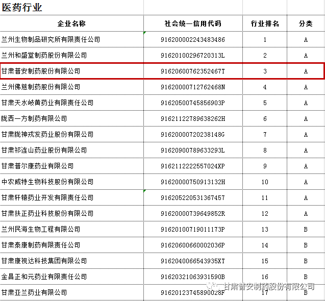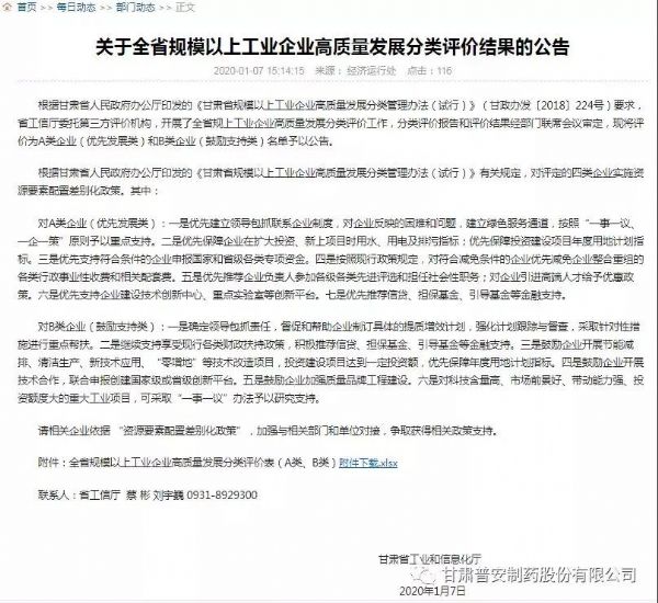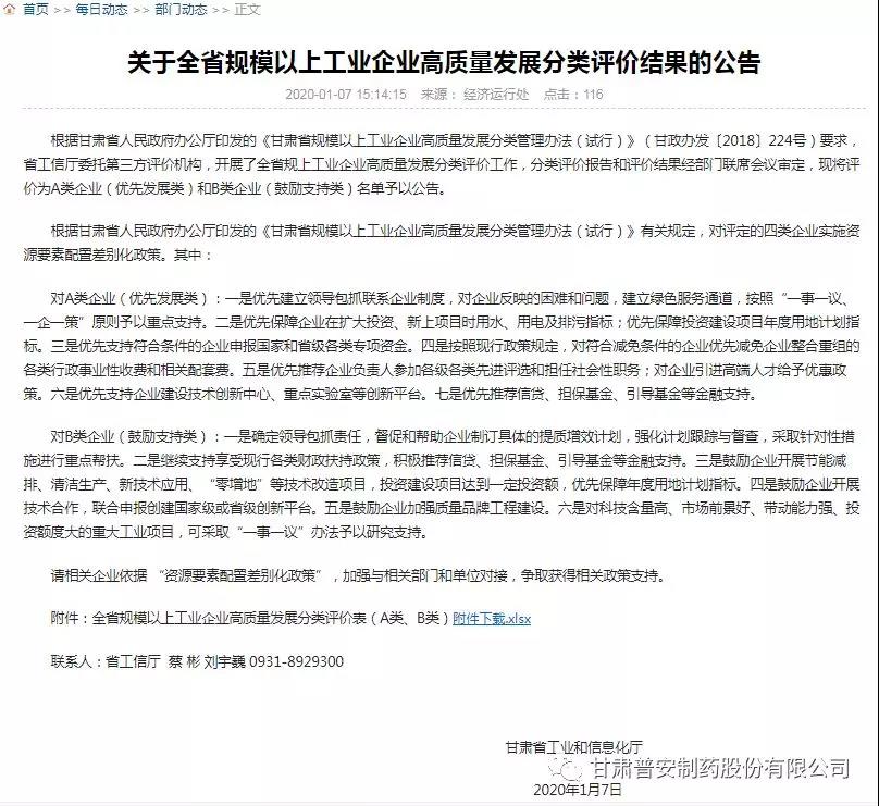 1月7日,根據(jù)甘肅省工業(yè)和信息化廳發(fā)布的“關(guān)于全省規(guī)模以上工業(yè)企業(yè)高質(zhì)量發(fā)展分類評價結(jié)果”的公示,普安股份被評為全省規(guī)模以上工業(yè)企業(yè)高質(zhì)量發(fā)展A類(優(yōu)先發(fā)展類)企業(yè),位列醫(yī)藥行業(yè)前三。此次分類評價工作經(jīng)專業(yè)第三方評價機(jī)構(gòu)評審,分類評價報告和評價結(jié)果經(jīng)部門聯(lián)席會議審定,最終確定企業(yè)分類評價結(jié)果。普安股份將依據(jù) “資源要素配置差別化政策”對A類企業(yè)的規(guī)定,加強(qiáng)與相關(guān)部門和單位對接,爭取獲得相關(guān)政策支持。