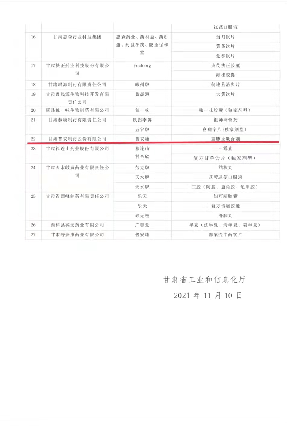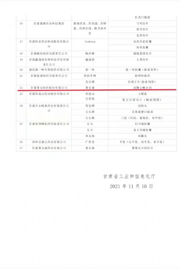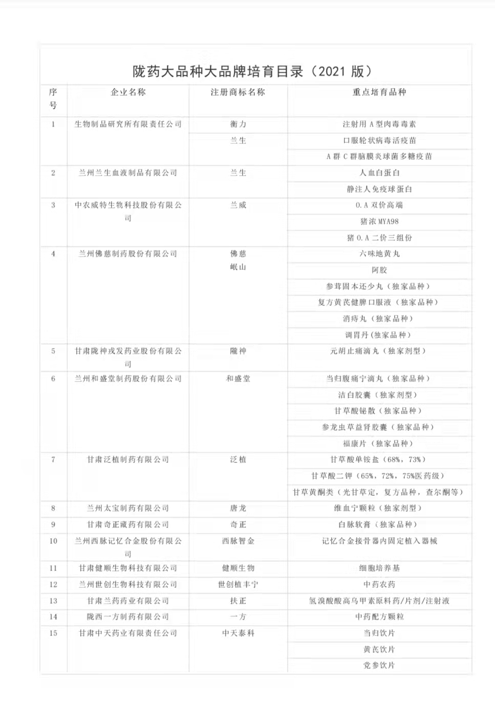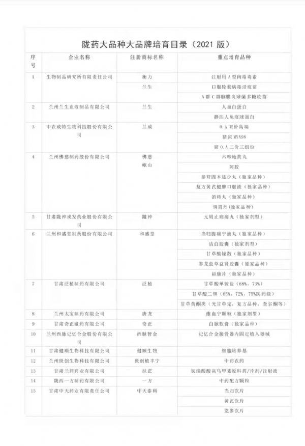 為切實(shí)抓好隴藥大品種大品牌培育工作,根據(jù)《甘肅省人民政府辦公廳關(guān)于支持隴藥大品種大品牌推動龍頭企業(yè)發(fā)展政策措施的通知》(甘政辦發(fā)〔2018〕131號)要求,經(jīng)公示無異,現(xiàn)將隴藥大品種大品牌培育目錄(2021版)予以公告。