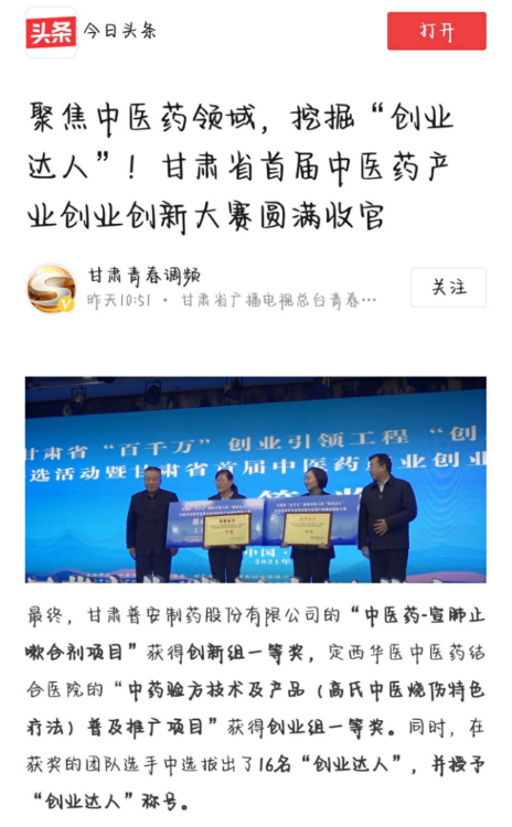 此次大賽也受到了媒體朋友的高度關(guān)注,相繼由人民網(wǎng)、中新網(wǎng)、今日頭條、試聽甘肅、新甘肅、甘肅青春調(diào)頻等多家媒體相繼報(bào)道了甘肅普安制藥股份有限公司在此次大賽中獲得創(chuàng)新組一等獎(jiǎng)及“創(chuàng)業(yè)達(dá)人”稱號(hào)的事宜。