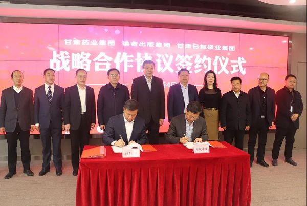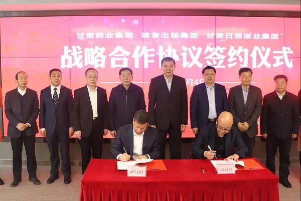 甘肅藥業(yè)集團(tuán)和讀者出版集團(tuán)有限公司、甘肅日報(bào)報(bào)業(yè)集團(tuán)有限責(zé)任公司在甘肅新媒體集團(tuán)舉行戰(zhàn)略合作簽約儀式,竇生銘代表集團(tuán)公司簽署協(xié)議。