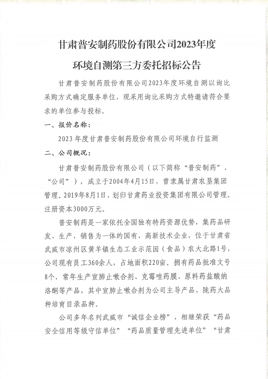 甘肅普安制藥股份有限公司2023年度環(huán)境自測第三方委托招標公告