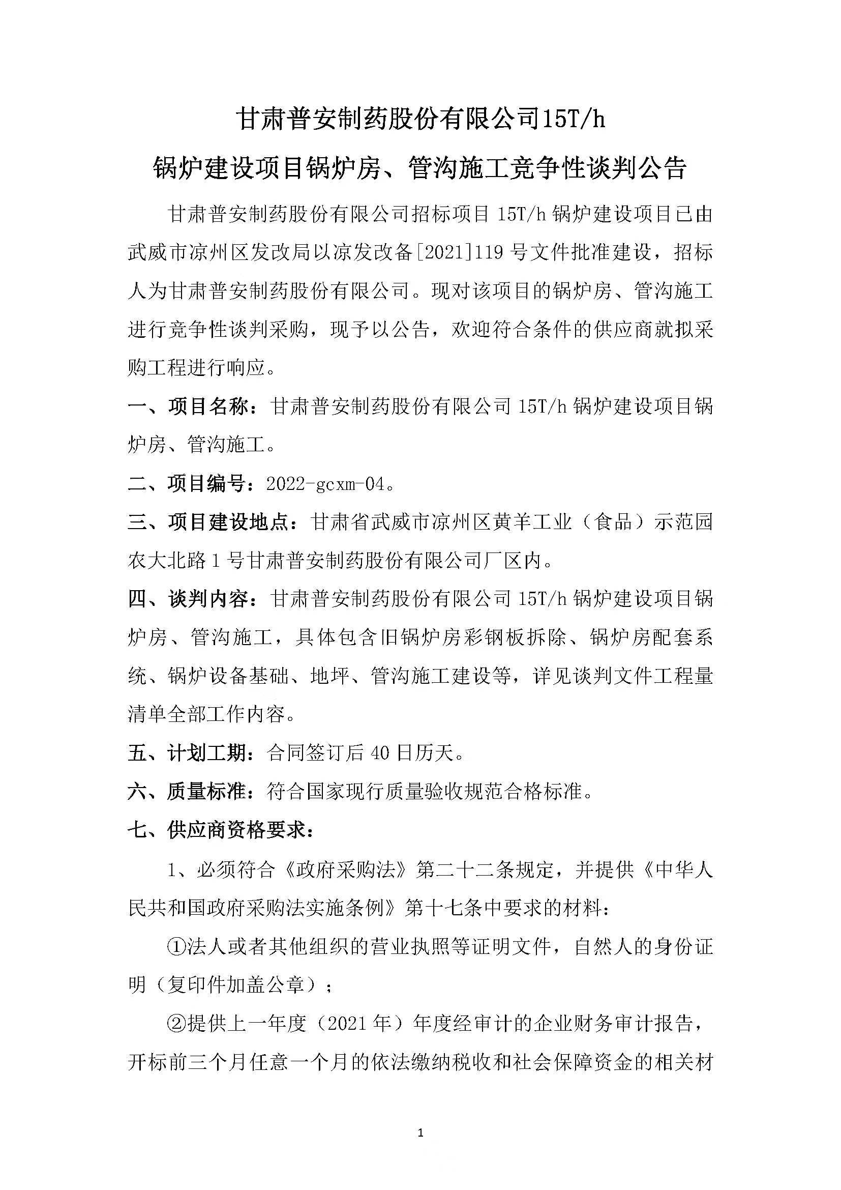 甘肅普安制藥股份有限公司15T/h鍋爐建設(shè)項(xiàng)目鍋爐房、管溝施工競(jìng)爭(zhēng)性談判公告