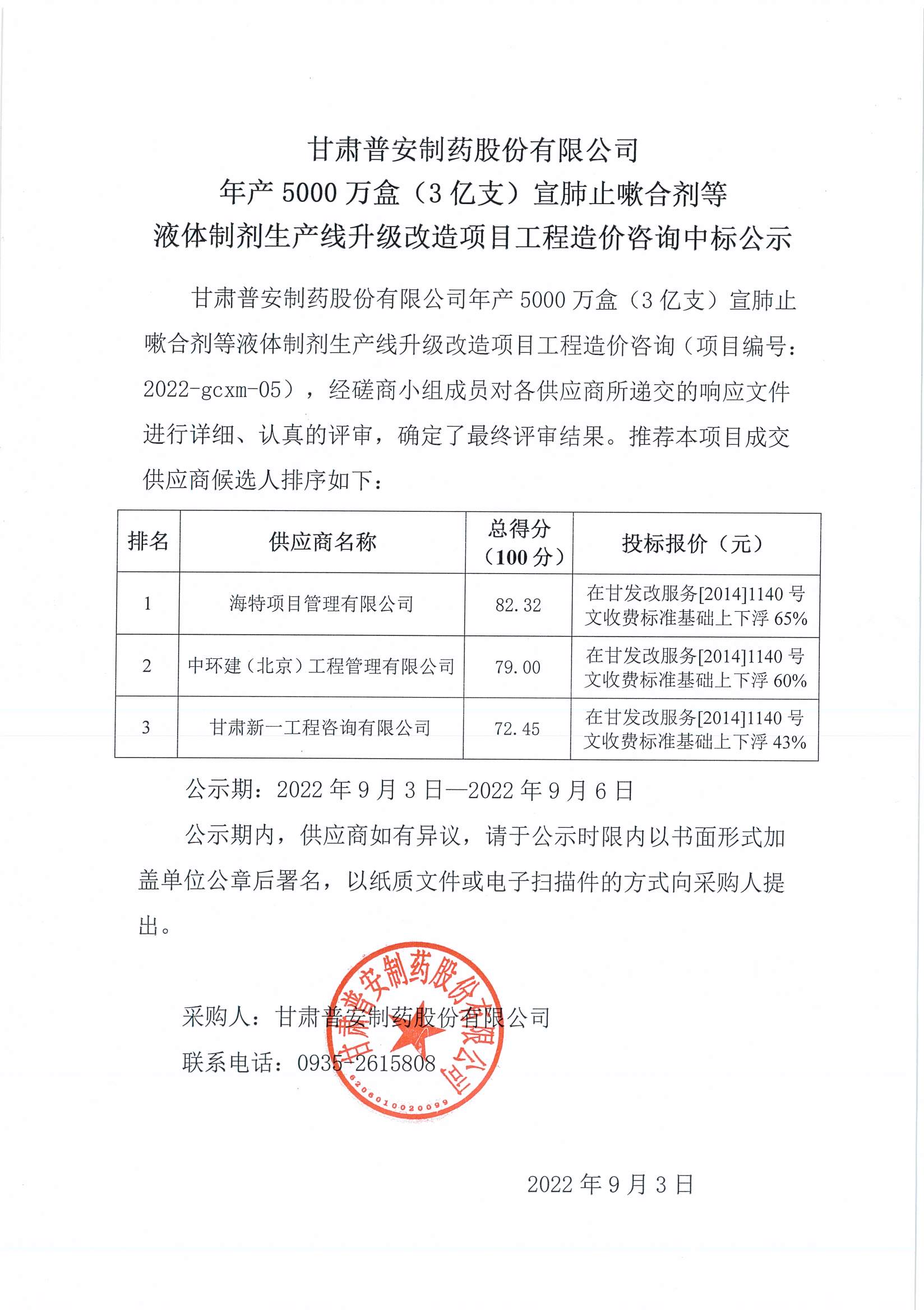 甘肅普安制藥股份有限公司年產(chǎn)5000萬盒(3億支)宣肺止嗽合劑等液體制劑生產(chǎn)線升級改造項目工程造價咨詢中標公示