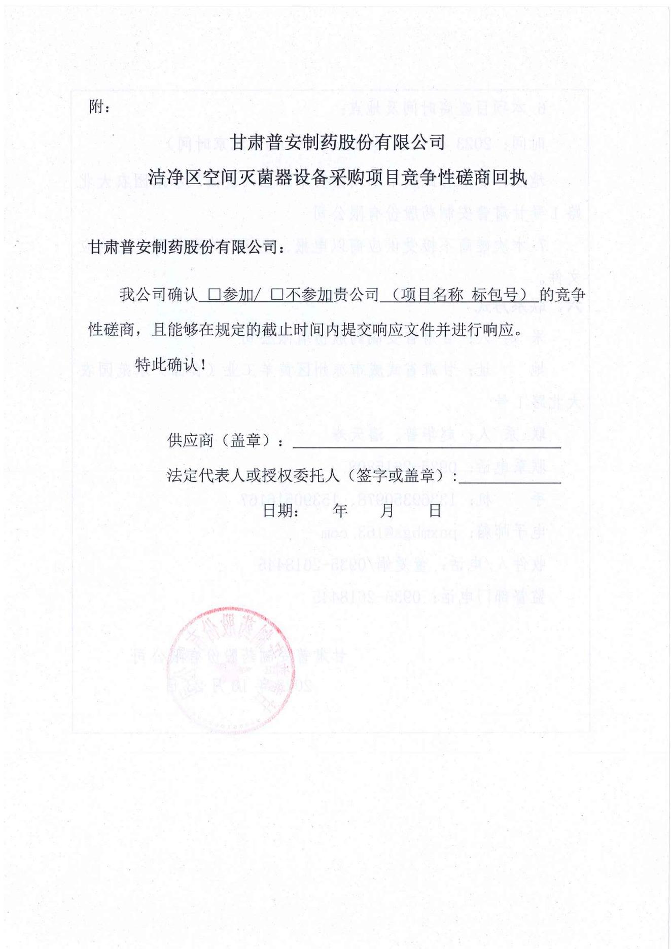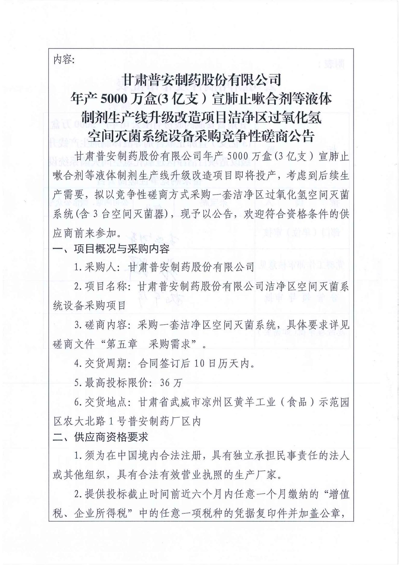 甘肅普安制藥股份有限公司年產(chǎn)5000 萬盒(3億支)宣肺止嗽合劑等液體制劑生產(chǎn)線升級改造項目潔凈區(qū)過氧化氫空間滅菌系統(tǒng)設(shè)備采購競爭性磋商公告