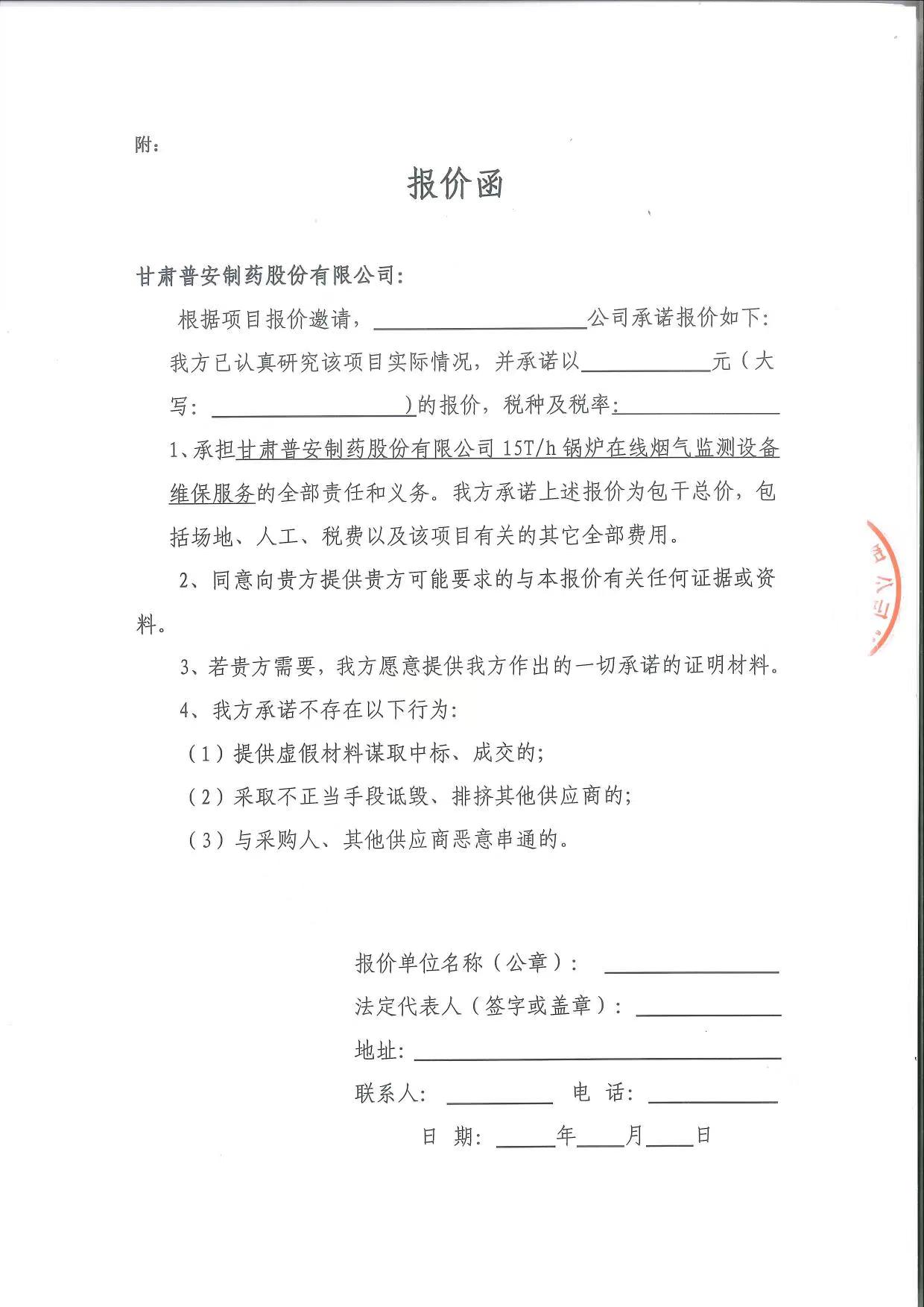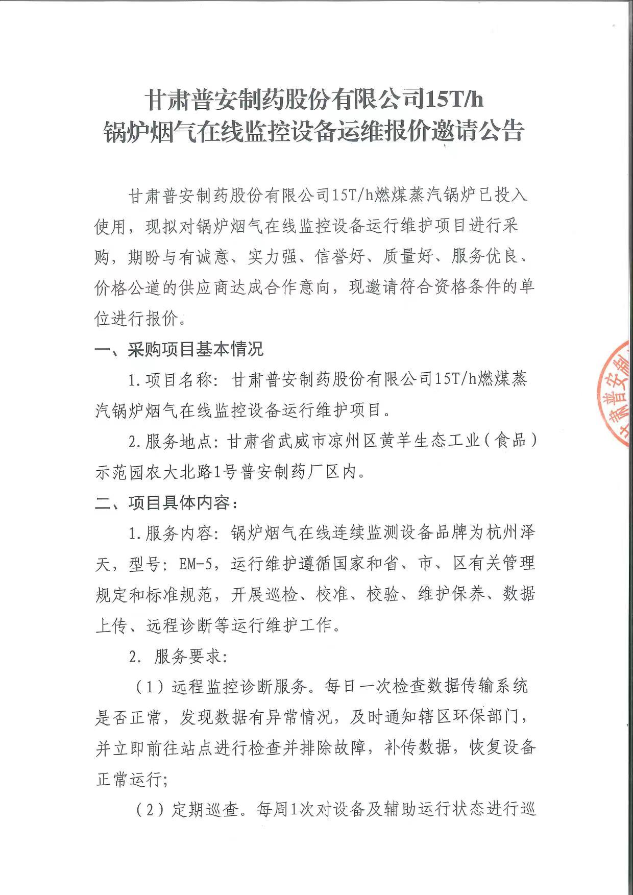 甘肅普安制藥股份有限公司15T/h鍋爐煙氣在線監(jiān)控設(shè)備運(yùn)維報(bào)價(jià)邀請(qǐng)公告