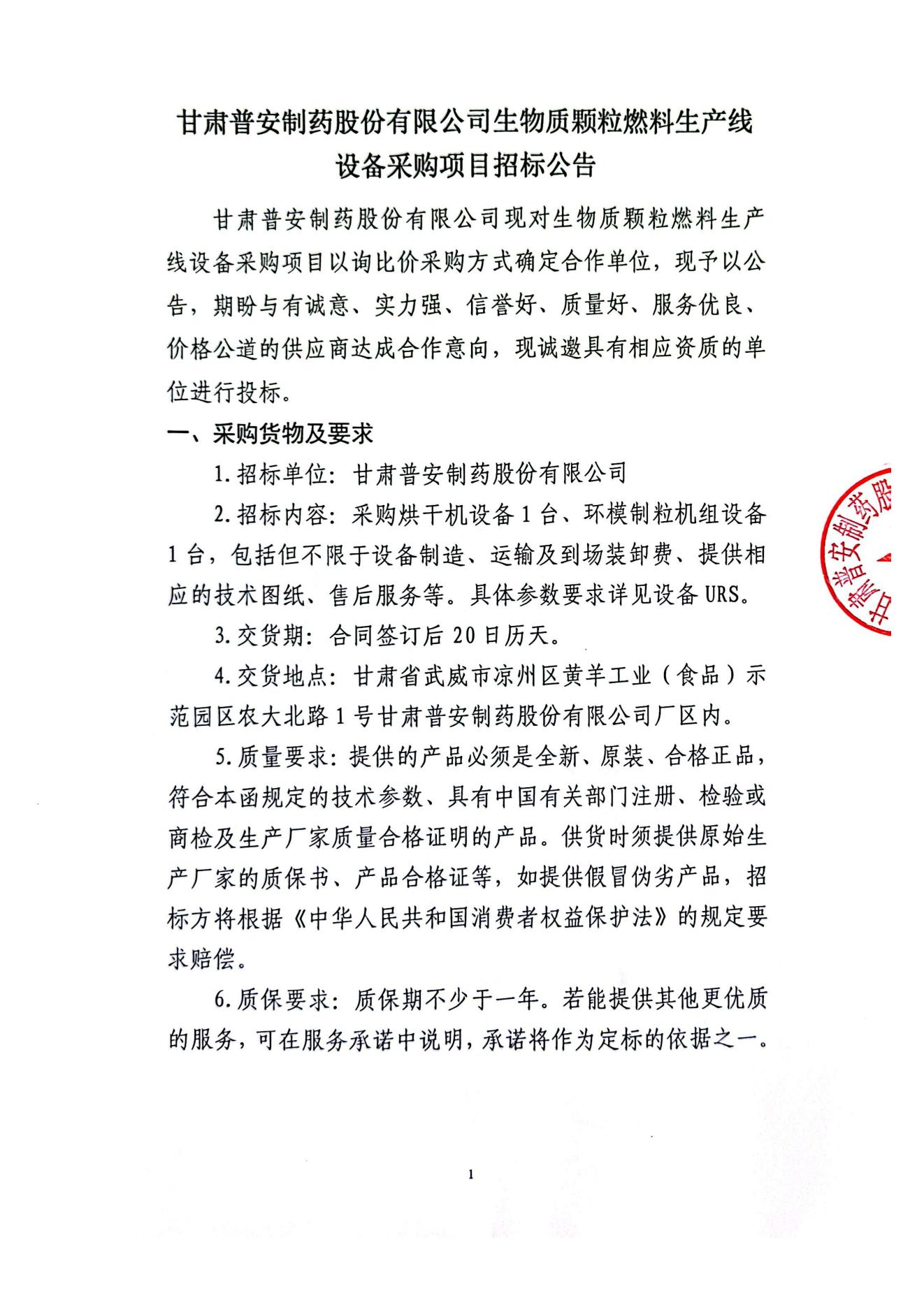 甘肅普安制藥股份有限公司生物質(zhì)顆粒燃料生產(chǎn)線設備采購項目