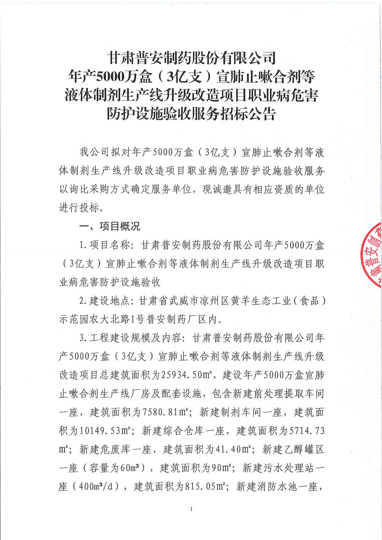 甘肅普安制藥股份有限公司年產(chǎn)5000萬盒(3億支)宣肺止嗽合劑等液體制劑生產(chǎn)線升級改造項目職業(yè)病危害防護(hù)設(shè)施驗收服務(wù)招標(biāo)公告