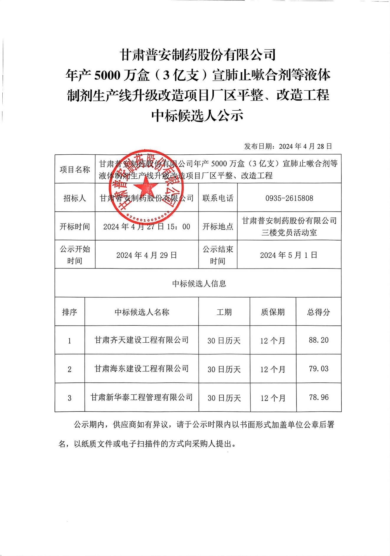 甘肅普安制藥股份有限公司年產(chǎn)5000萬(wàn)盒(3億支)宣肺止嗽合劑等液體制劑生產(chǎn)線升級(jí)改造項(xiàng)目廠區(qū)平整、改造工程中標(biāo)候選人公示