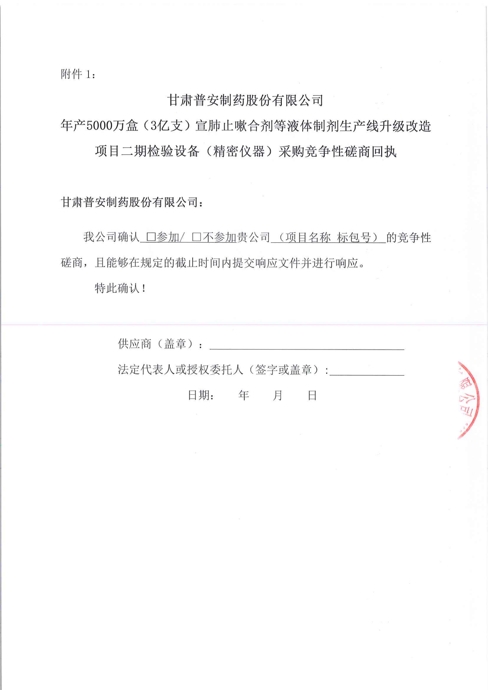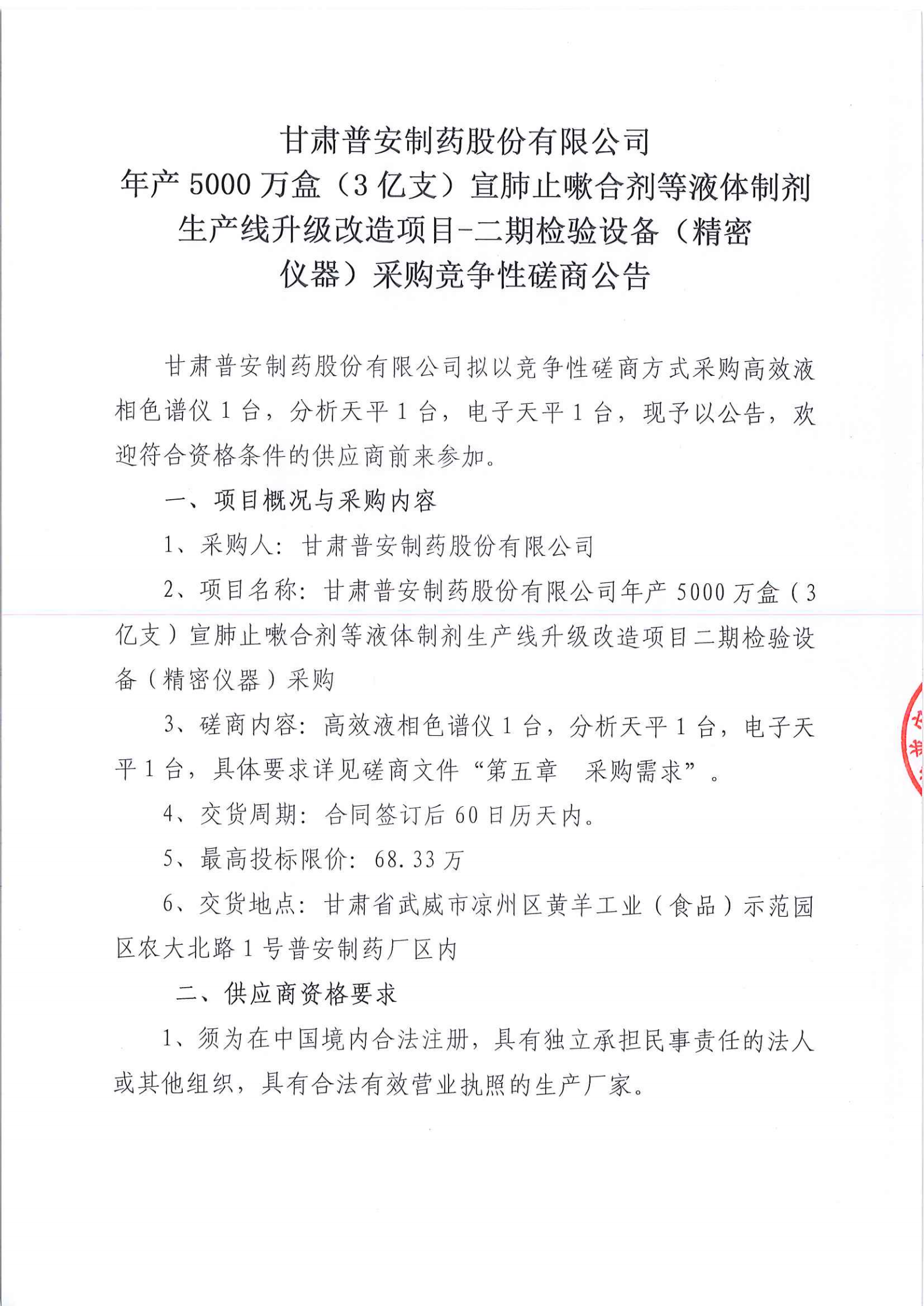 甘肅普安制藥股份有限公司年產(chǎn)5000萬盒(3億支)宣肺止嗽合劑等液體制劑生產(chǎn)線升級(jí)改造項(xiàng)目二期檢驗(yàn)設(shè)備(精密儀器)采購競爭性磋商公告