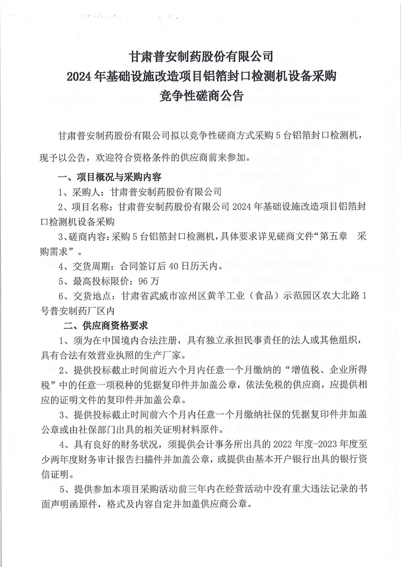 甘肅普安制藥股份有限公司2024年基礎(chǔ)設(shè)施改造項(xiàng)目鋁箔封口檢測(cè)機(jī)設(shè)備采購(gòu)競(jìng)爭(zhēng)性磋商公告