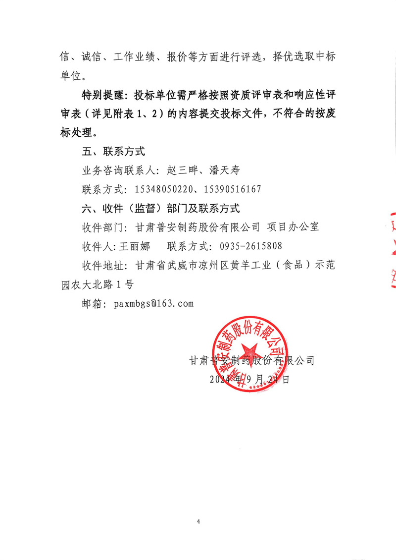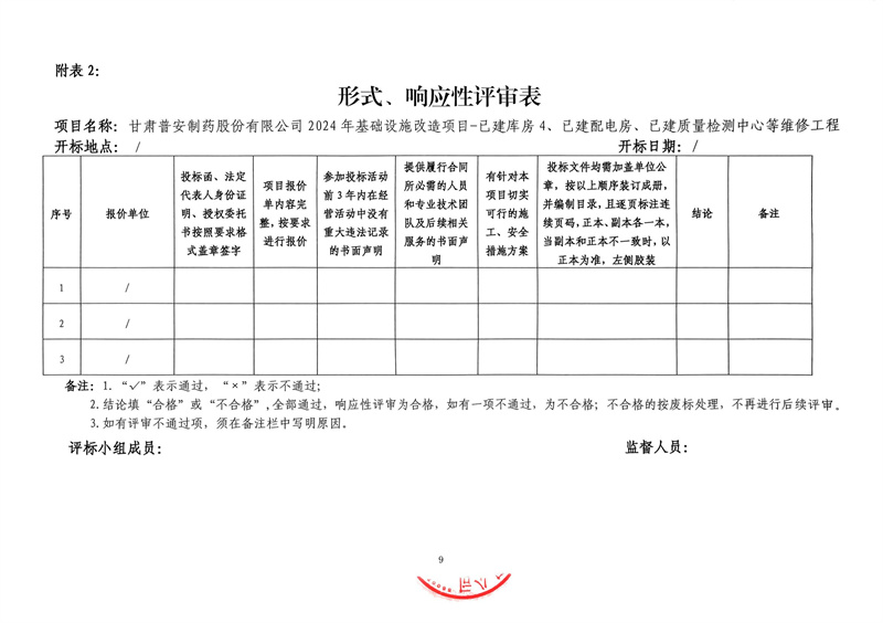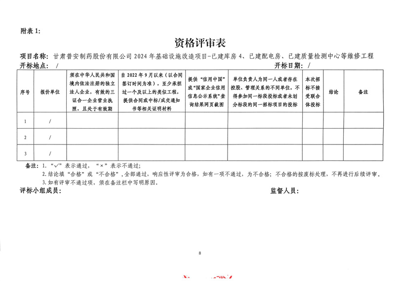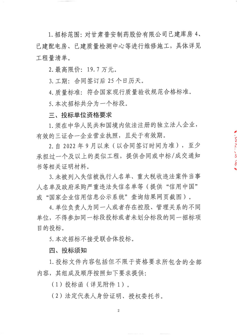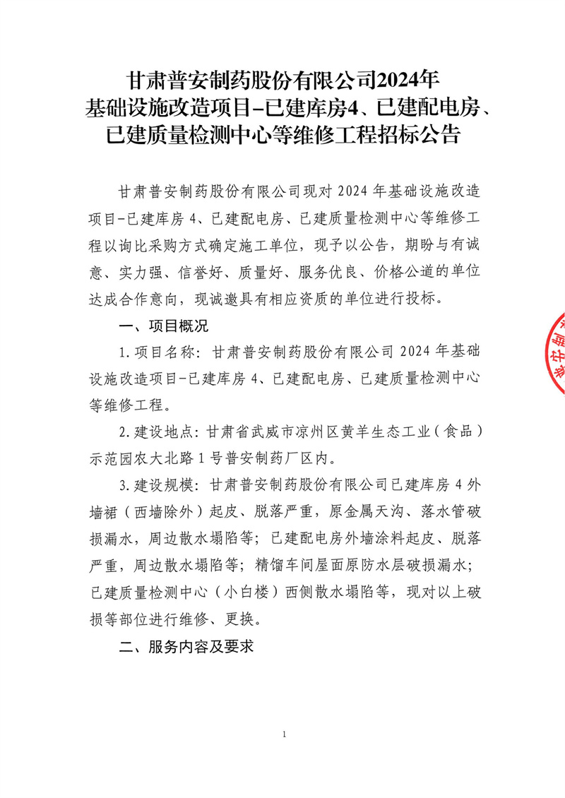 甘肅普安制藥股份有限公司2024年基礎(chǔ)設(shè)施改造項目-已建庫房4、已建配電房、已建質(zhì)量檢測中心等維修工程招標(biāo)公告