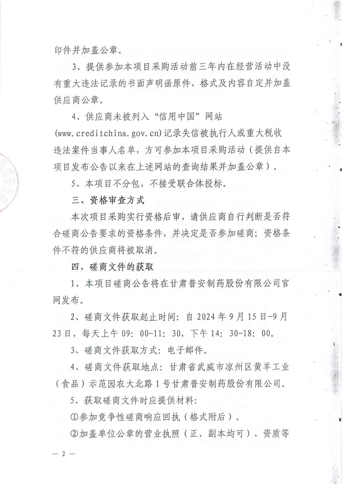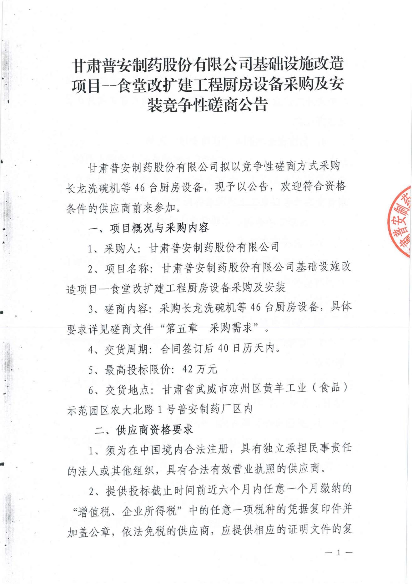甘肅普安制藥股份有限公司基礎(chǔ)設(shè)施改造項(xiàng)目--食堂改擴(kuò)建工程廚房設(shè)備采購及安裝競(jìng)爭(zhēng)性磋商公告